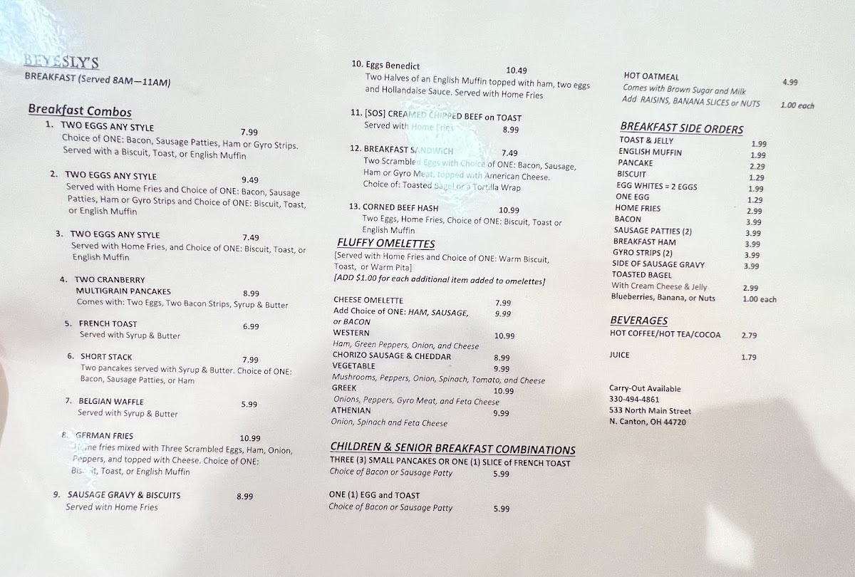 Welcome to Beyesly's Restaurant, a delightful gem nestled at 533 N Main St, North Canton, OH. This cozy diner captures the essence of a home-cooked meal with a charming, welcoming atmosphere. The menu showcases a blend of American classics and Greek-inspired dishes, offering something for everyone.